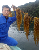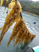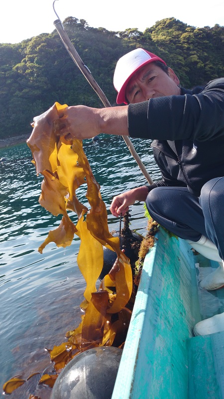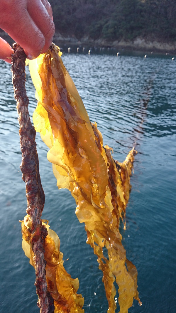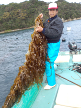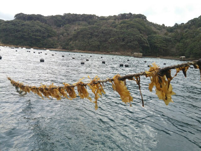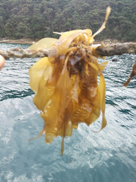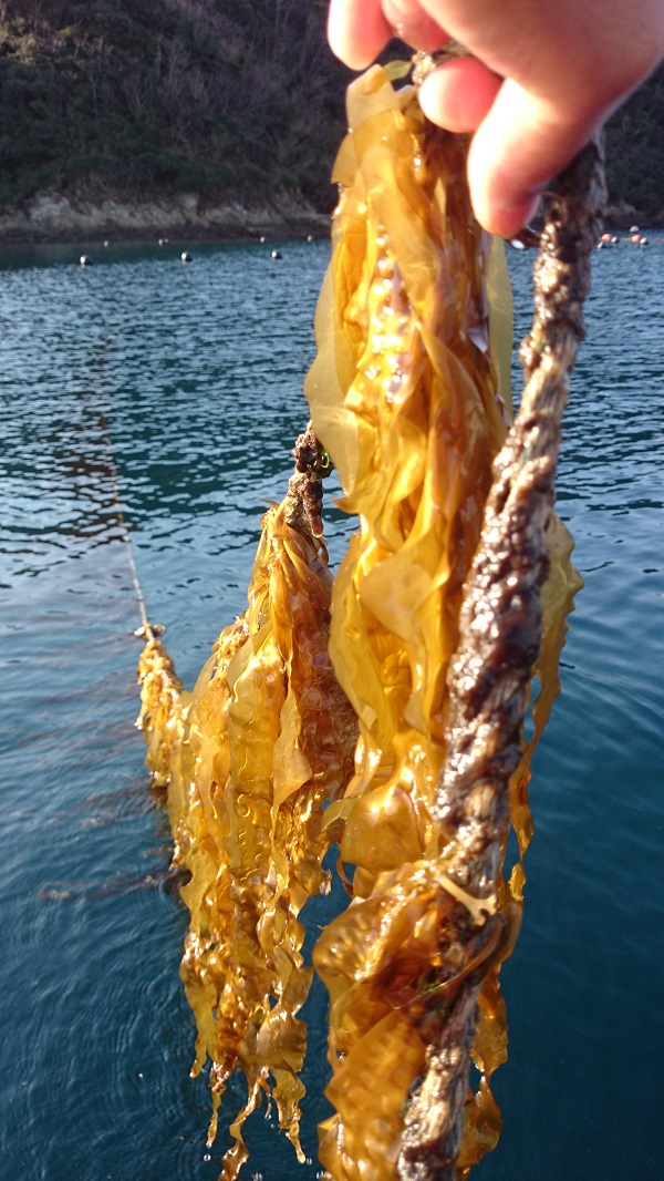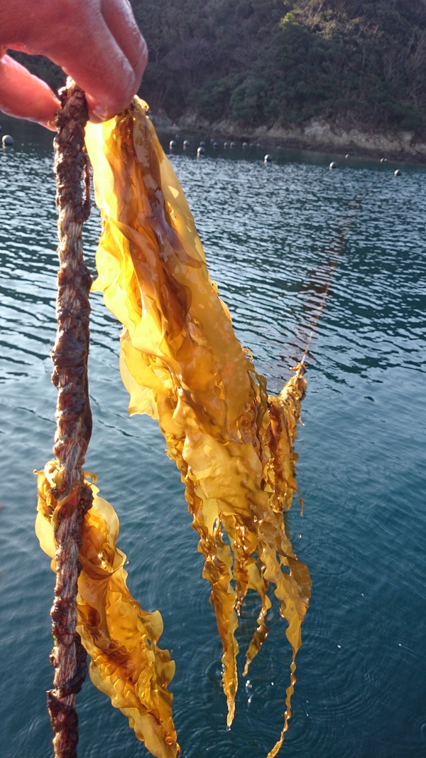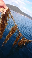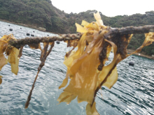 説明:長崎県五島のコンブ養殖に食害が現れました。コンブの先が大きくかじられています。現在の水温は15.5度です。多分、雑食魚イスズミ(スズキ目イスズミ科;全長70cm)によるものと考えられます。