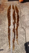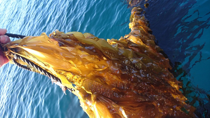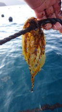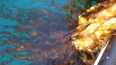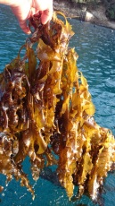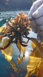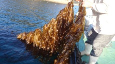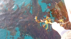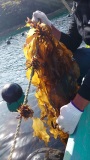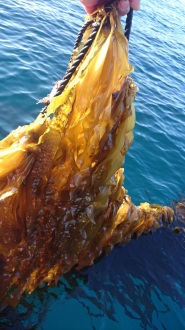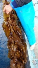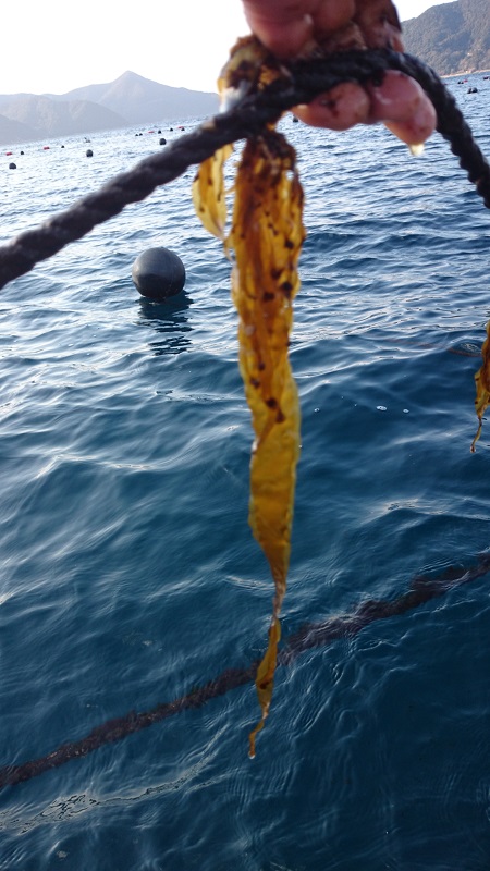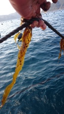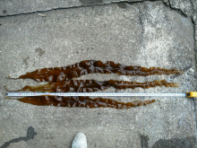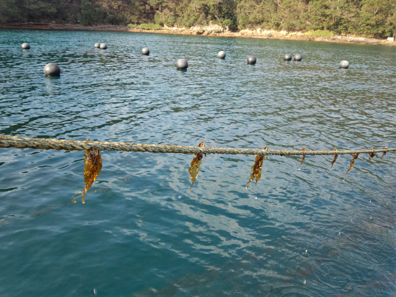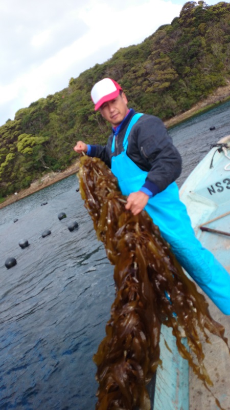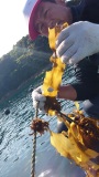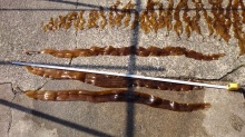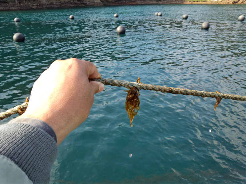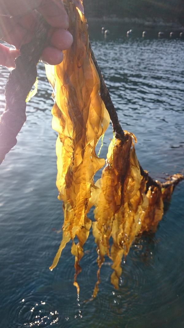 説明:長崎県五島のコンブ養殖に食害が現れました。コンブの先が大きくかじられています。現在の水温は15.5度です。多分、雑食魚イスズミ(スズキ目イスズミ科;全長70cm)によるものと考えられます。
