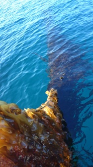 海の環境は2015.1.12現在の水温は14.4度です。「上の3枚の写真は、12月初旬に沖出ししたワカメ。1方、下の3つの写真は12月下旬に沖出ししたコンブです。 |
