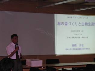 海の森づくりシンポジウム Uが海と森と里と都市を結ぶ循環型地域づくりや食料の安定供給・自給率の向上に寄与することを目的にシンポジウムが7月9日(土)日大駿河台校舎にて開催されました。今回のシンポジウムでは、「コンブ類海藻を用いた海の森づくりの効果」と題し、コンブを用いた海中林と海岸構造物を用いた海の森づくりによる環境修復効果と経済的効果などについて高知大学の大野正夫名誉教授に、「こんぶを液化処理で養魚資料に開発」と題し、海藻類が持つ養魚の脂質代謝や抗ウイルス効果などについて製造方法も交え、久原水産生態研究所所長の久原俊之先生に、「海の森づくりと生物生産性」と題し、海藻類とくにコンブの生産力は高いが蓄積効果低いことなどについての講演があり、今後の海の森づくりの推進に示唆に富んだ内容でした。