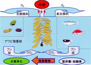 環境負荷型単一養殖から環境保全型複合養殖への変換を提言、特に浅海養殖場での海藻による水質浄化の例を紹介し、魚類と海藻類と貝類との環境保全複合エコ養殖の講演および海の森づくりパネル展示