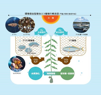 複合エコ養殖とは、給餌養魚に伴う糞尿や残餌を利用して、海藻類(コンブ・ワカメ・アカモク・アオサ)や貝類(アワビ・ウニ)、底生生物(ナマコ・エビ)を共生させて養殖する形態のことです。浅海養魚場の周辺で周年栽培する海藻は、養魚の排泄中の窒素・燐の栄養塩やCO2を吸収して成長し、養魚にO2を供給し、病原菌や赤潮も抑制する効果がある。