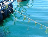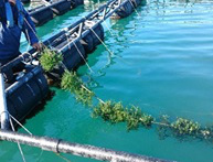 海面養殖は、魚類養殖に使われていた10mx10mの生け簀浮き台を用いて20本のロープに、約20cm間隔に、越冬タンク培養されていた種苗を手のひら程度に分割して、プラステック紐(ひも)で結びつけたロープは、約水深50㎝にアンカーを両端につけて沈下した。養殖区域の水温は5月上旬に20℃以上になり、6月に23℃、7月に24~28℃、8月に29~32℃になる。9月より水温は低下して25~28℃、10月から12月なで徐々に低下して行き20℃になると海面養殖を終了した。葉体は6月に入って水温の上昇とともに成長速度は増大し、日間成長率は3~4 %に達した。