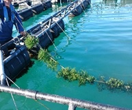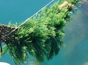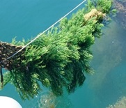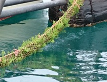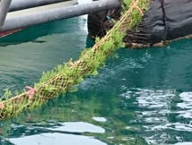 現在外海での養殖では、ロングライン方式で養殖が行われているが、ロープから波浪で葉体が落ちる量が多い。そこで、外海用には網袋に葉体を入れて、キリンサイの養殖を試みた。新しい葉体は網の外で伸長した。問題点は網の素材であった。クレモナ糸は太いと汚れが著しい。海苔網の素材で行ったが、網の汚れも少なく、挿入する種苗を大きくすれば良い。今後の外海のキリンサイ養殖では、網にキリンサイを挿入した養殖法の開発が課題でなるであろう。